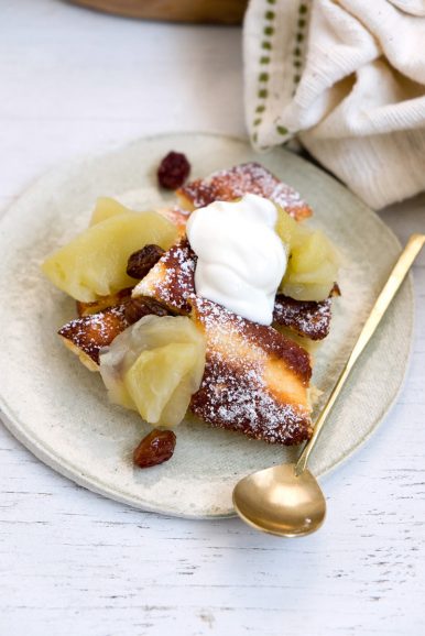 This dish, or meal, is commonly served in Bavaria and Austria for lunch and sometimes dinner. Typically stewed plums, apricots, apple sauce or cranberries are served alongside. The Kaiserschmarrn is a large pancake which is pulled apart after cooking and there are so many legends surrounding the name. “Schmarrn” loosely translates into “nonsense or mess”, and the story I grew up with is Emperor Franz Joseph’s cook messed up when flipping the pancake and spontaneously tore apart the rest of the pancake, served some stewed fruit with it and called it a new creation. I can relate to the pancake tearing apart when being flipped, since mine wanted to do just that. But instead of muttering “Schmarrn!”, a word I like to use, I was happy that the pancake was doing just what it was supposed to do.