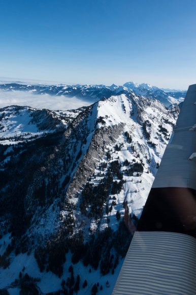 Our flight was headed for St. Moritz, via the Julierpass which also is the only road kept open in winter, but about halfway into our flight, I noticed the clouds started to get lower and there was snow falling outside. I wondered if we’d even make it to St. Moritz or if we would have to turn around and fly back. As there are no modern instruments in the plane, the pilots fly only where they can see clearly. The flight over the Julierpass wasn’t going to happen. The plane dipped and made a hairpin turn as we turned back and the pilots decided to fly via Davos and the Flüelapass into the Engadin valley.
